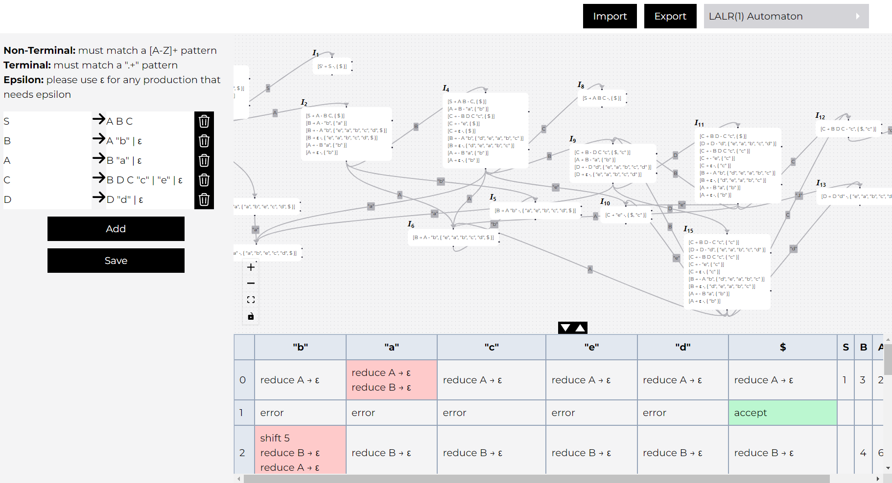 The LALR(1) Automaton page shows the LALR(1) Automaton and the LALR(1) parsing table in the results panel for the current grammar.